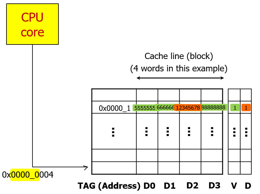 하나의 캐시 블록(캐시 라인)은 한번에 4개 워드를 관리한다.
