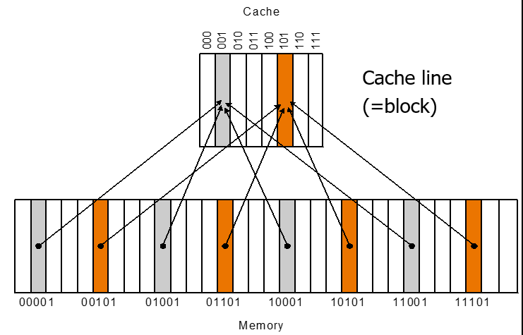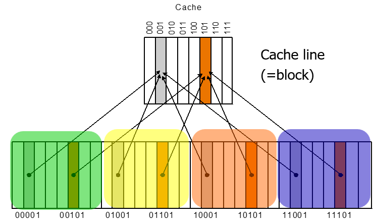 그런데 문제는 메인 메모리에 있는 블록 개수가 캐시의 블록 개수보다 많아서 당연히 여러 메모리 블록이 하나의 캐시 블록을 공유할 수 밖에 없다. 따라서 가급적 공평하게 분배해야 좋다.