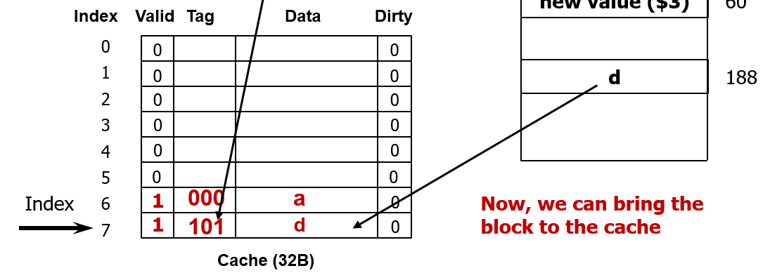현재 캐시에는 아무런 데이터가 없으므로 캐시는 메모리로부터 데이터를 갖고 온다.