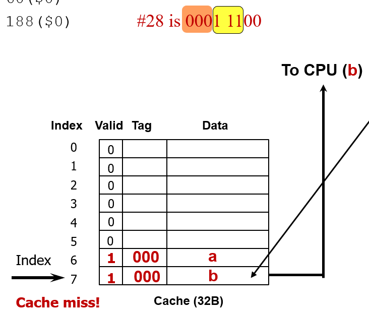(3개 비트인 이유는 캐시 블록의 크기가 8개이기 때문이다.)