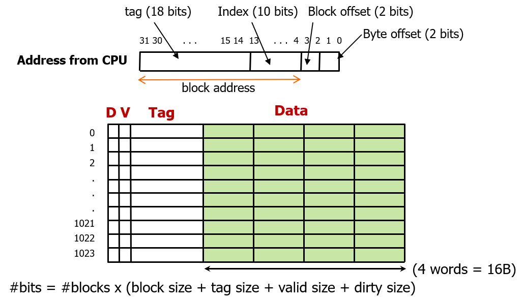 16kb direct mapped cache 에서 한 블록의 크기가 4-word 라면, 32bit 주소 체계하에서 캐싱할 때 얼마나 많은 bit가 필요할까?