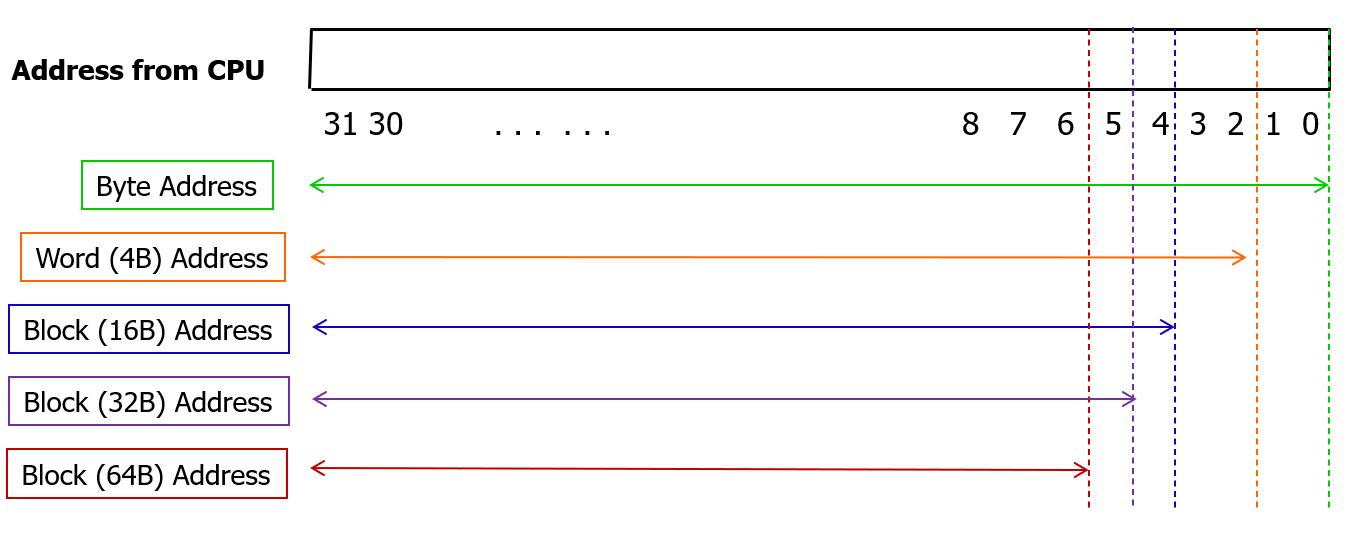지금까지 블록으로 이야기를 했는데, 실제 메모리 주소는 어쨌든 Byte Address로 표기되어 있다.