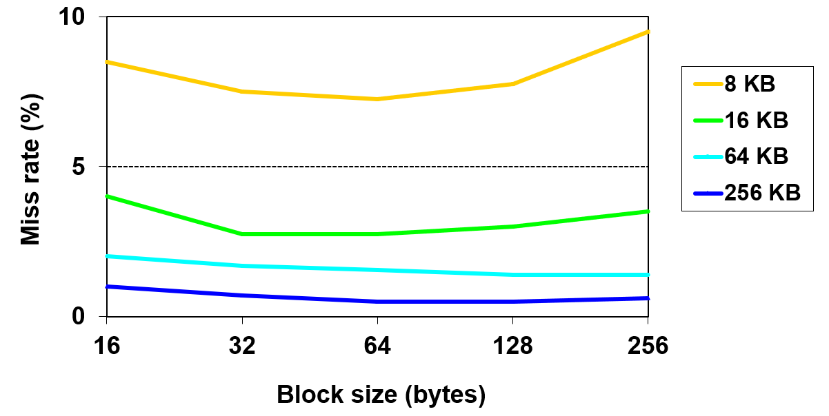 처음에는 Miss rate가 줄어들다가 block size가 너무 커지면 오히려 miss rate도 같이 증가하는 것을 볼 수 있다.