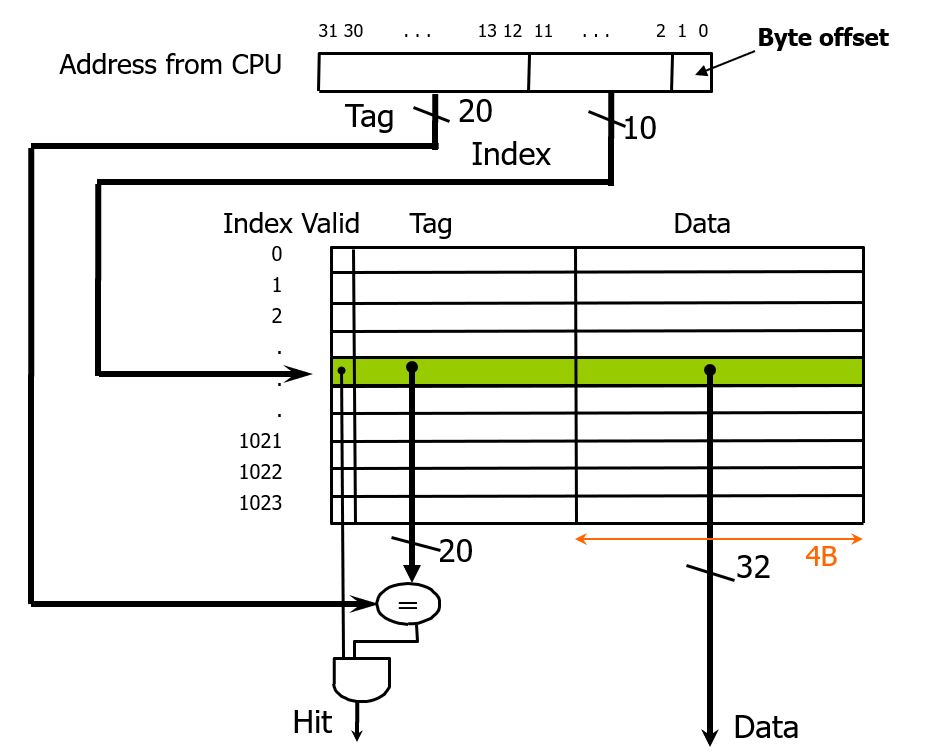 bit 숫자로 볼 때 캐시에는 data 말고도 valid, tag 와 같은 부가적인 정보(오버헤드)가 함께 저장된다.