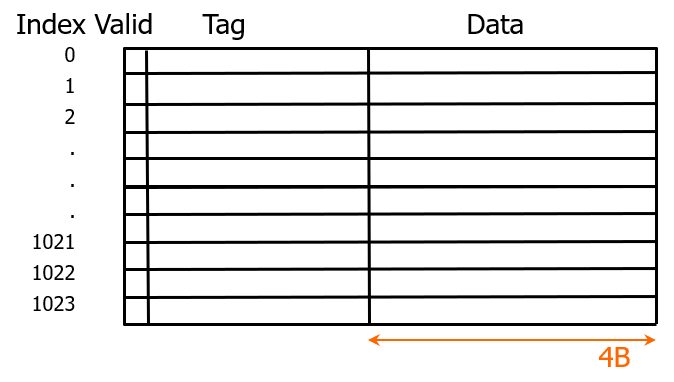 캐시 사이즈가 4KB 이고, 1블록의 크기가 4word 라고 해보자.