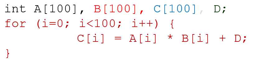 100개 원소를 갖는 배열 3개와 변수 하나를 선언했고, 반복문을 돌면서 배열의 원소에 접근해서 값을 계산하고 있다.