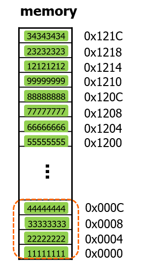 녹색칸마다 4byte씩 주소가 증가하므로, 녹색 1칸은 4byte 크기를 갖는다는 것을 알 수 있다.