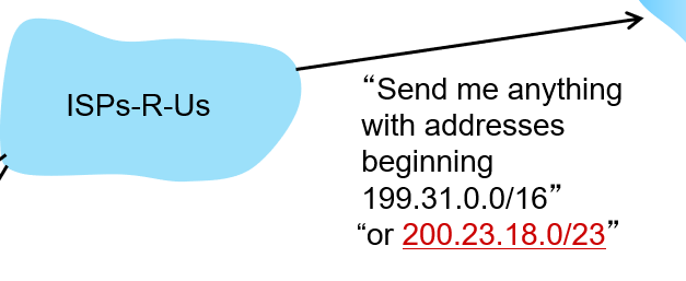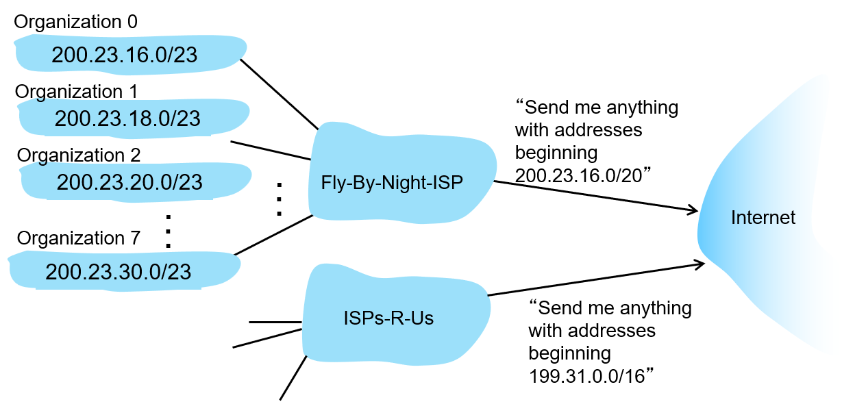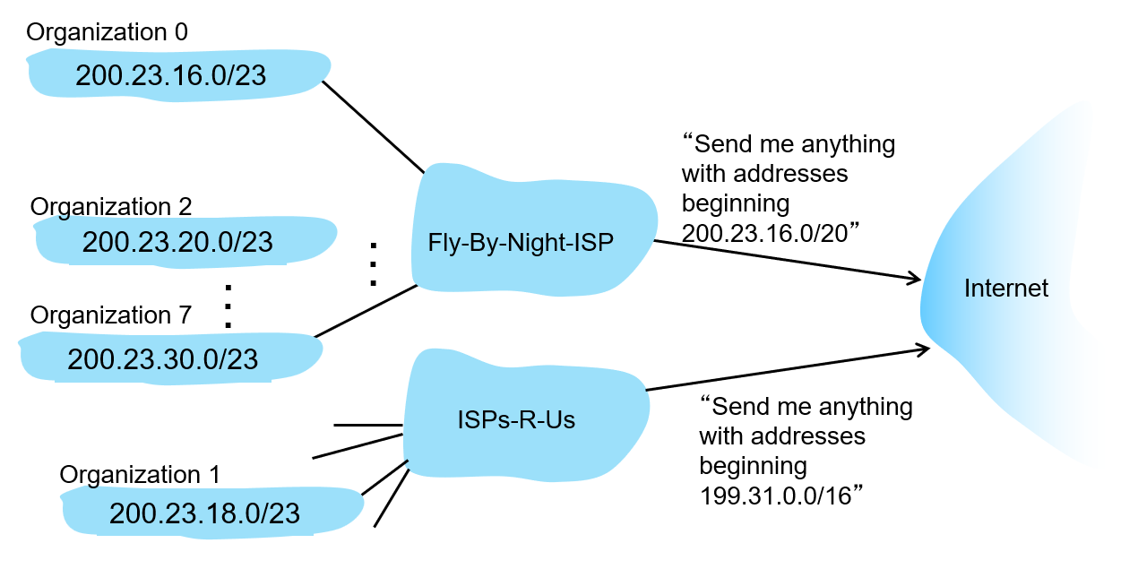 첫번째 ISP 는 200.23.16 이라는 20bit 서브넷을, 두번째 ISP는 199.31 이라는 16bit 서브넷을 갖고 있다.