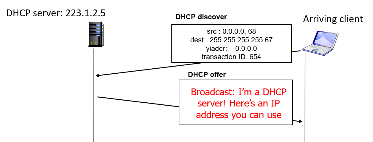 만약 DHCP 서버가 새로 온 클라이언트의 요청을 받았다면, 다시 브로드캐스트 방식으로 자신의 IP주소를 알린다.