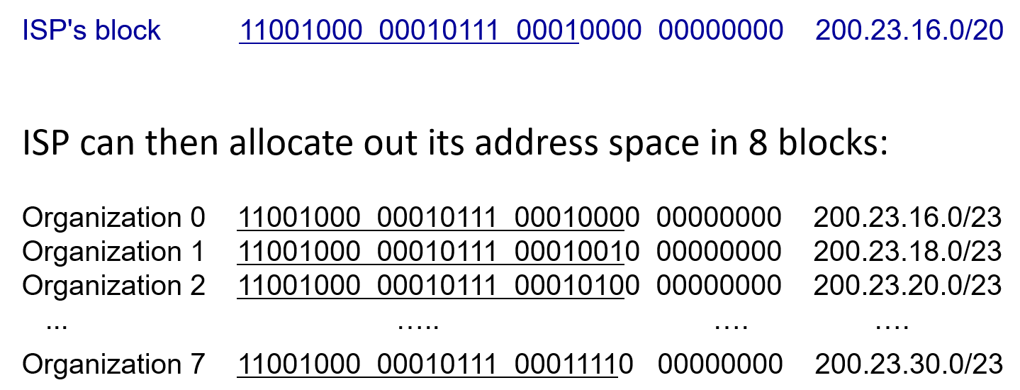 예를 들어 IP 주소 100개를 필요로 한다면, ISP가 서브넷 파트를 25bit로 만든 다음, 이 서브넷을 고객사에 할당해주는 것이다. 그러면 고객사는 그 서브넷 밑에서 128개의 IP주소를 사용할 수 있게 된다.