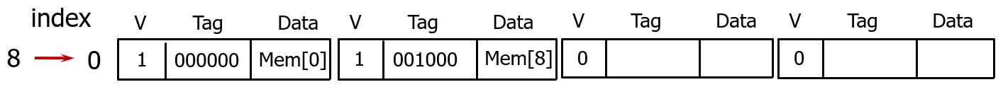위 그림과 같이 8개 캐시 블록이 있을 때는, 0부터 7까지 인덱스를 보고 하나를 직접 매핑해서 들어간다.