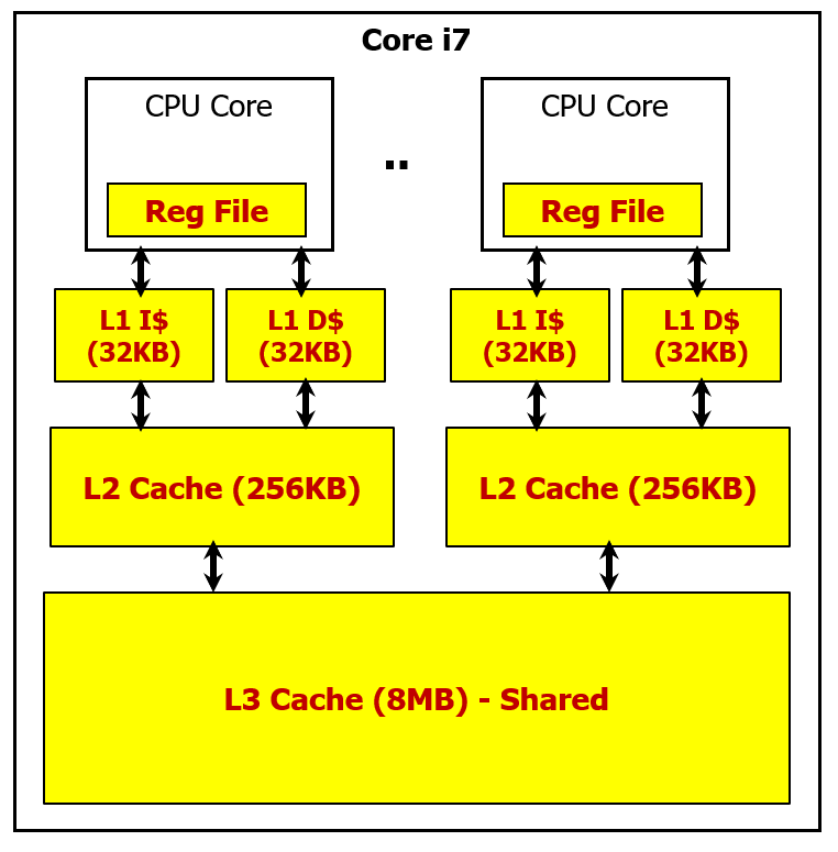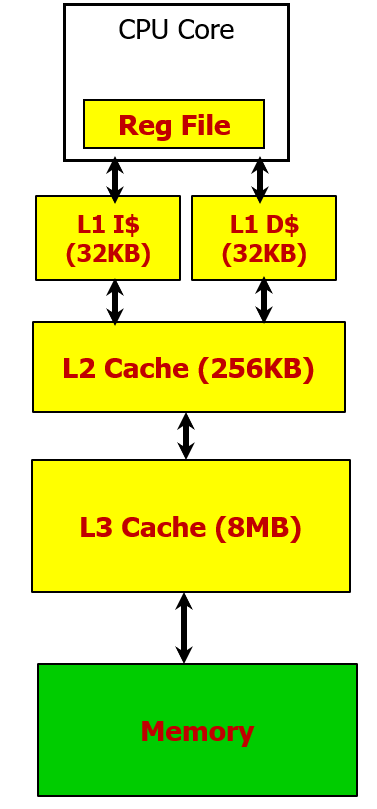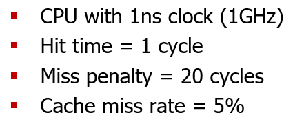 만약 L1 에서 miss가 발생했는데, L2에서 hit가 발생한다면, 이때 캐시에서 데이터를 가져오기까지 필요한 사이클 수는 5ns 를 주기인 0.25 ns 로 나누면 20cycle이 필요하다는 것을 알 수 있다.