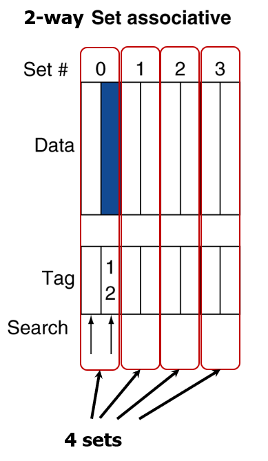 위 그림과 같이 8개 캐시 블록이 있을 때는, 인덱스가 가리키는 것이 set 인덱스가 되어, 인덱스가 가리키는 셋으로 가서 적절한 way를 선택해 데이터를 저장한다.