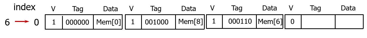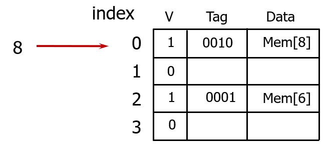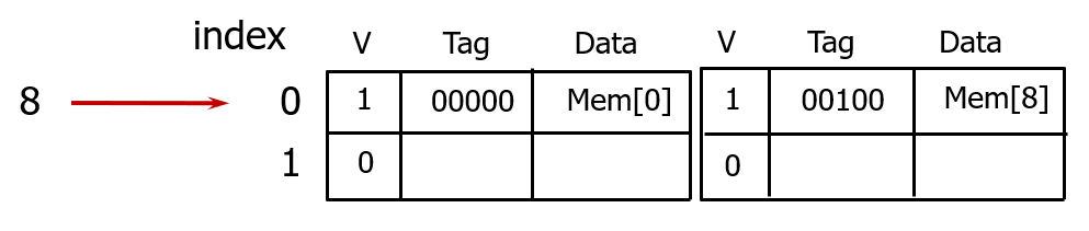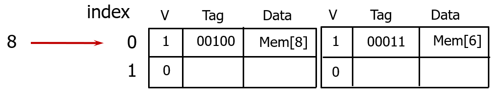 위 그림과 같이 8개 캐시 블록이 있을 때는, 인덱스를 보지 않고 직접 바로 이 셋에 접근해서 캐싱한다.