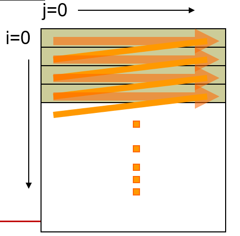 row-major ording에 따라서 배열에 접근하고 있어서 cache의 블록 내에 있는 데이터를 하나씩 순회하고, 한 블록의 데이터 순회가 끝나면 그 다음 블록에 있는 데이터를 읽기 때문이다.