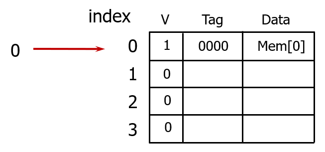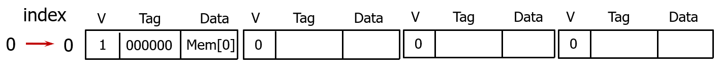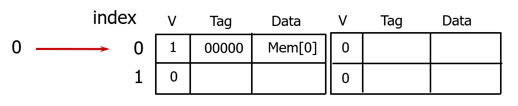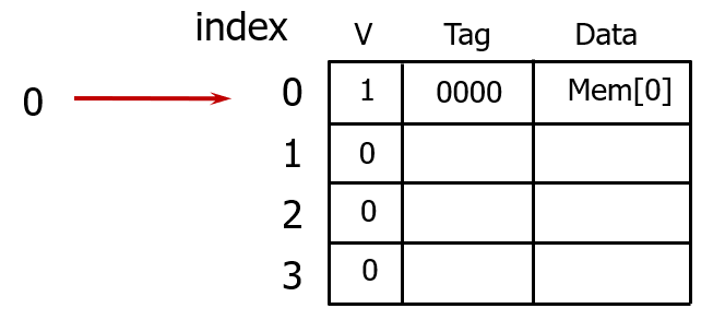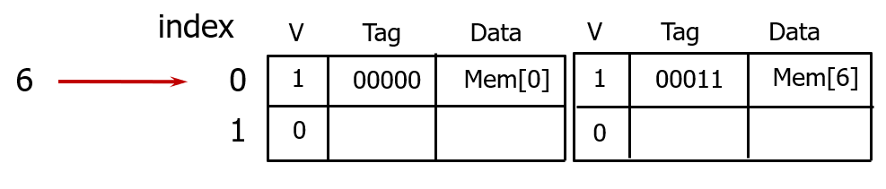 만약 같은 인덱스를 가리키는 다른 태그를 갖는 메모리 블록이 접근하면, 기존 캐시 블록 내용은 방출되고, 새로 접근한 메모리 블록 내용을 저장한다.