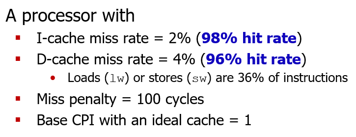 캐시 miss 가 2% 밖에 없음에도, 워낙 페널티가 커서 100% 캐시 Hit 가 발생했을 때보다 성능이 3배 안 좋아지는 것을 볼 수 있다.