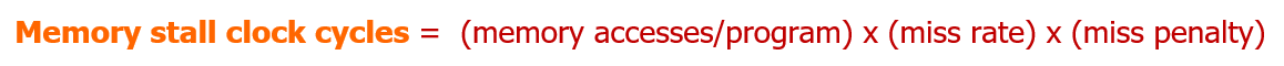 그러면 이제 Memory stall clock cycle 을 파악하기 위해, 프로그램이 갖고 있는 메모리 접근 횟수, 그리고 이 중에서 몇 번의 미스가 발생하는지 Miss Rate, 그리고 각 미스가 발생했을 때 추가되는 miss penalty 를 모두 곱하는 것으로 계산해볼 수 있다.