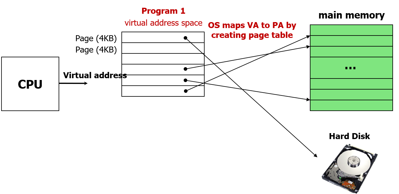 따라서 CPU는 프로그램을 실행할 때 virtual address를 이용해서 접근하면, 진짜 데이터를 가져오거나 저장하기 위해서는 매핑된 main memory 위치에 가서 데이터를 가져와야 한다.