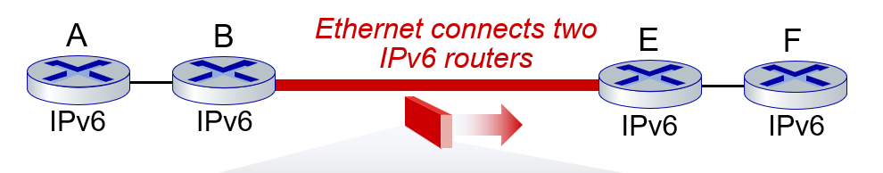 어떤 이더넷이 IPv6 라우터를 서로 연결하고 있다.