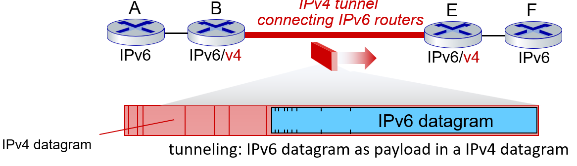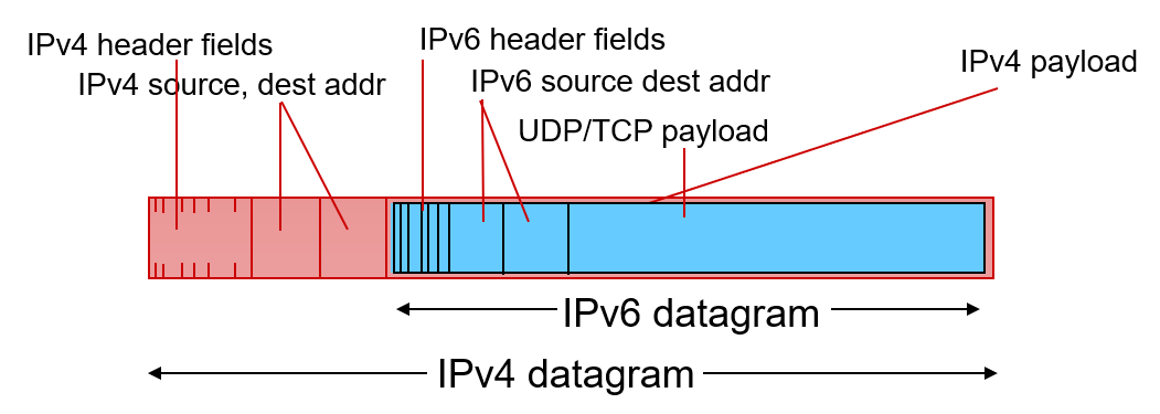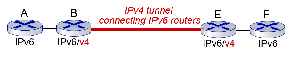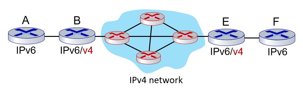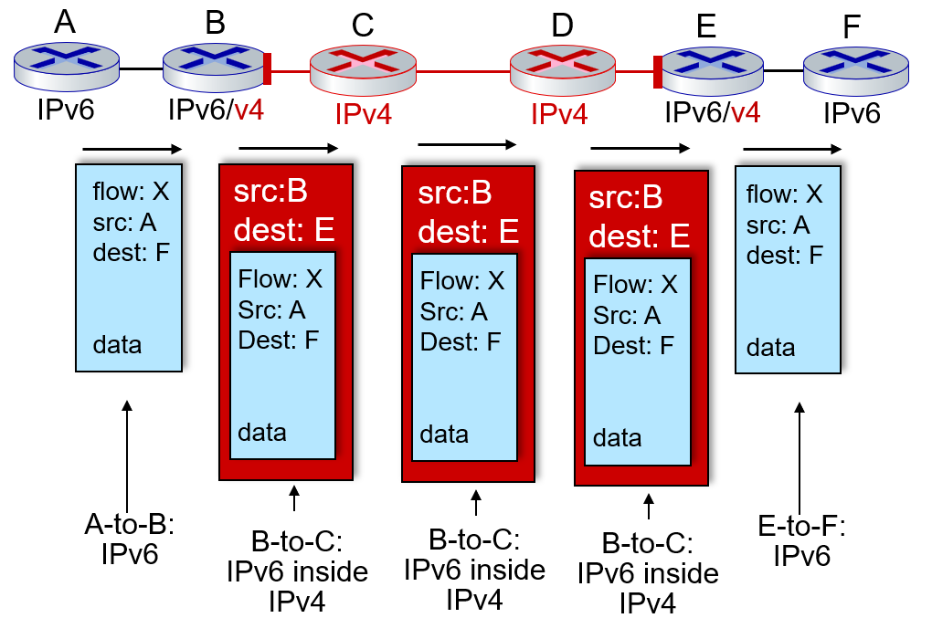 A-B, E-F 사이에는 IPv6 형태의 데이터그램을 주고 받고, 그 중간에는 IPv4 형태의 데이터그램을 주고 받아야하므로, 기존 IPv6 데이터그램을 IPv4 데이터 그램의 데이터로 넣어서 주고 받는다.