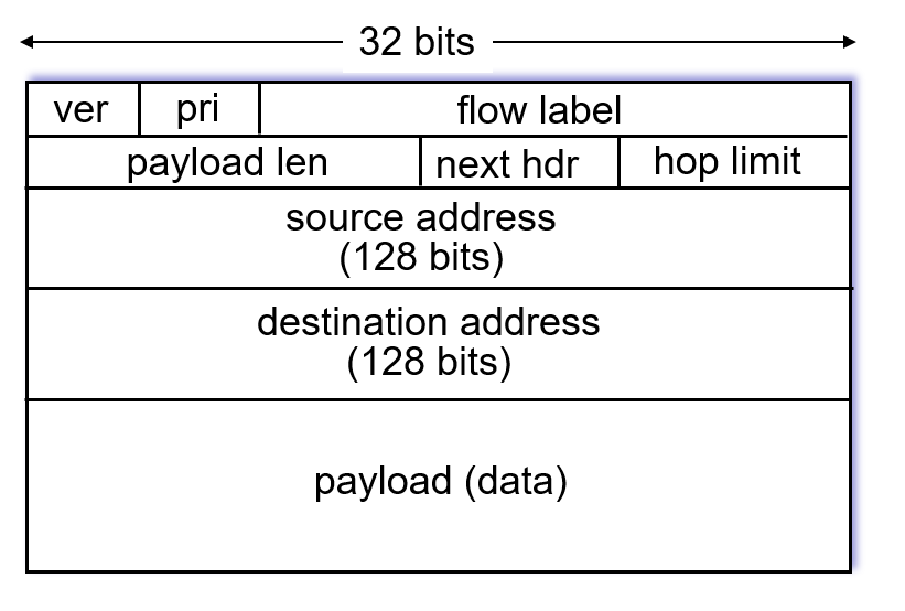 IPv4와 비교했을 때, 빠진 개념은 checksum, fragmentation / reassembly, option 이다.
