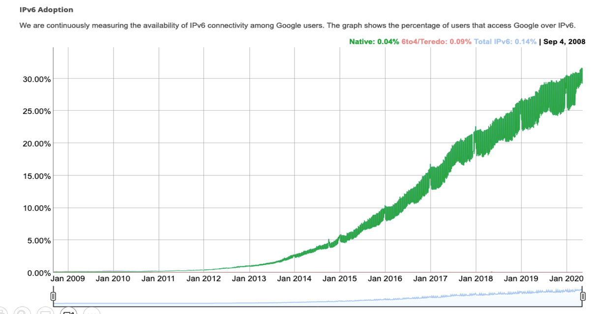 이 통계에 따르면 대략 30% 정도는 IPv6를 사용하고 있다는 것을 알 수 있다.
