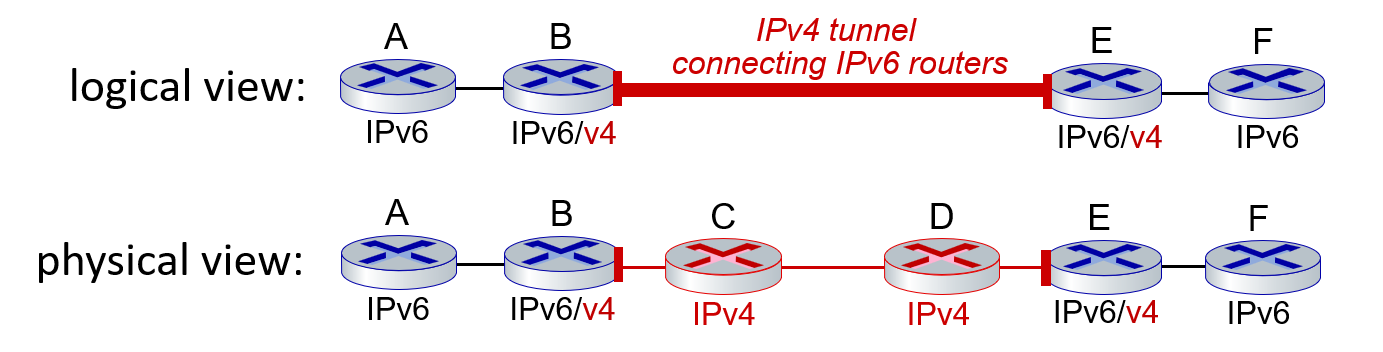 A-B, E-F 사이에는 IPv6 형태의 데이터그램을 주고 받고, 그 중간에는 IPv4 형태의 데이터그램을 주고 받아야하므로, 기존 IPv6 데이터그램을 IPv4 데이터 그램의 데이터로 넣어서 주고 받는다.