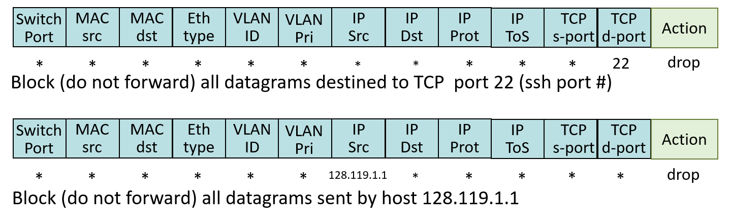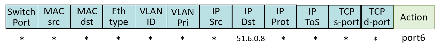 destination-based forwarding 에서는 순수하게 IP dest 정보만 봤지만, Generalized Forwarding 방식에서는 위와 같이 다양한 정보를 이용해서 action을 결정한다.