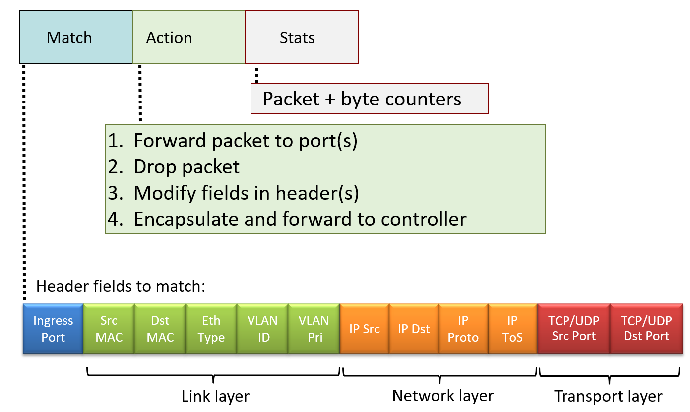 그래서 기존에 포워딩을 위해 match plus action을 할 때, match 는 목적지 주소가 제일 길게 일치하는 것을 보는 것이 match 였고, action은 forward 밖에 없었지만, 이걸 좀 더 일반화해서 match도 일반화시키고 action도 일반화 시켜보자는 아이디어로 나온 것이 generalized forwarding 이다.