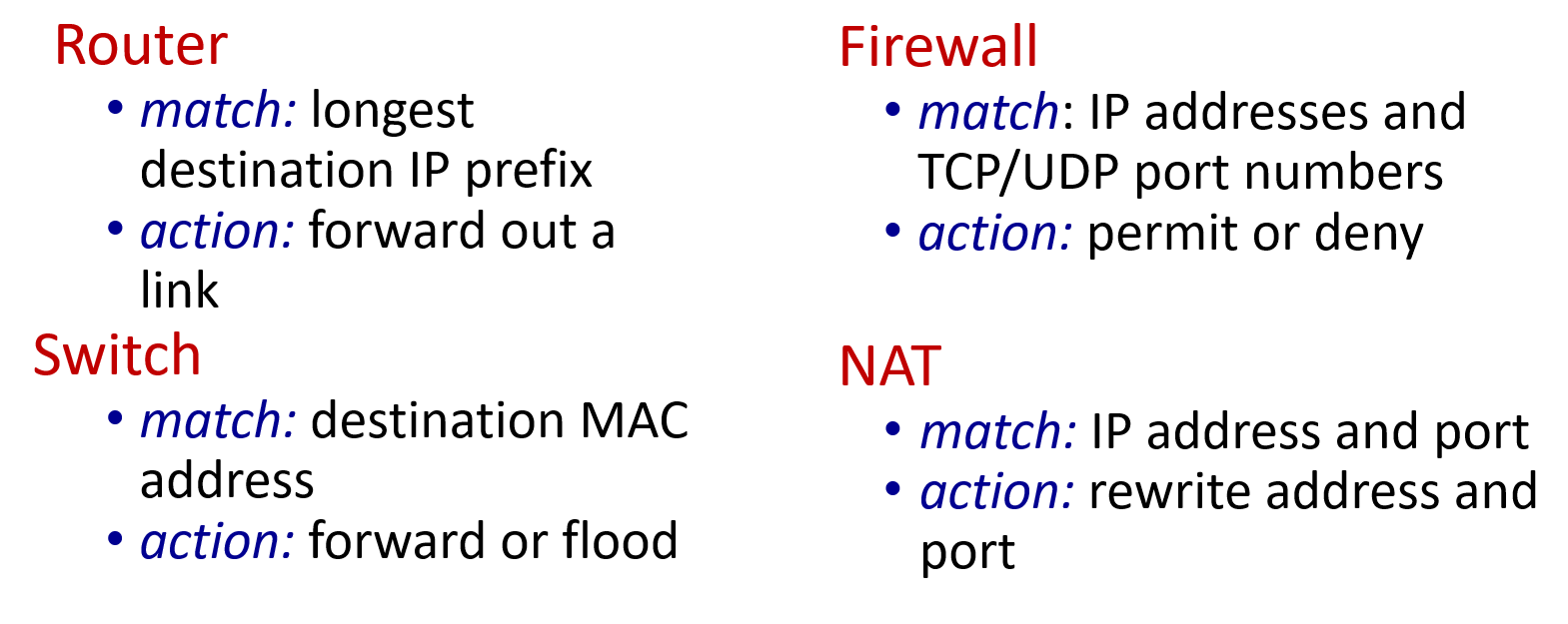 그래서 이렇게 예시에서 볼 수 있듯, SDN (Generalized Forwarding)을 사용하면 여러가지 다른 종류의 device를 추상화해서 흉내낼 수 있게 된다.