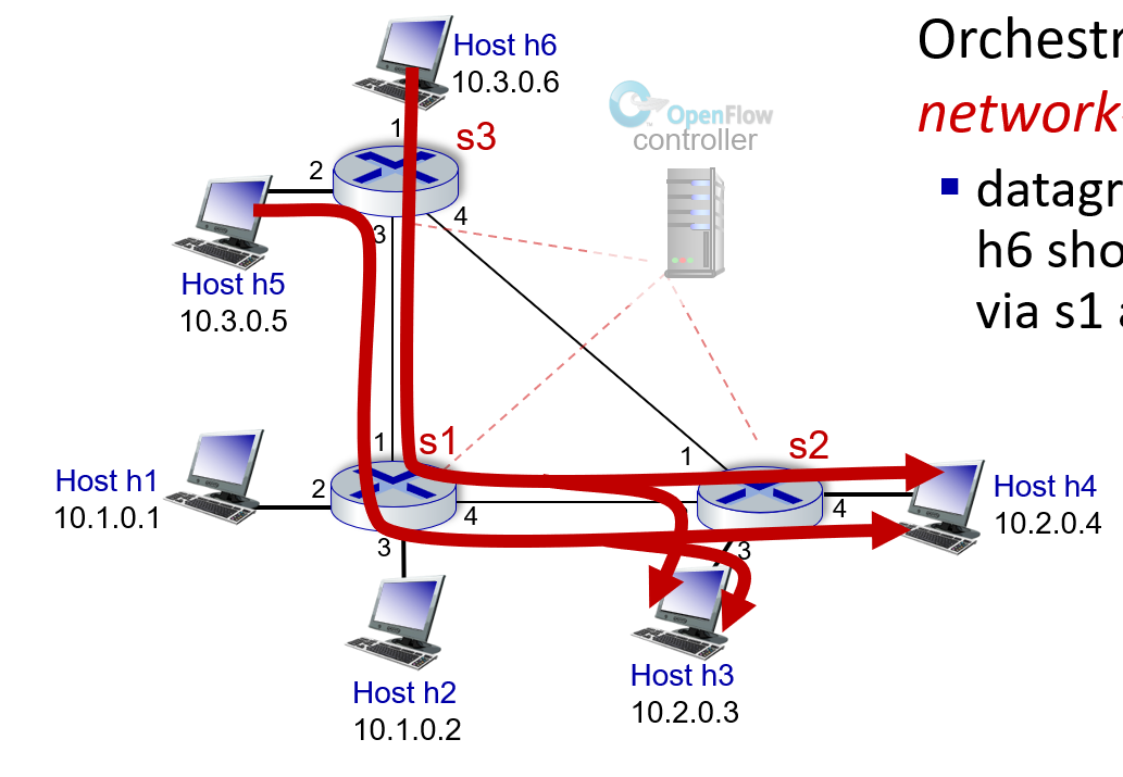 하지만 OpenFlow 방식은 컨트롤러가 만들어서 라우터들에게 뿌려준다.