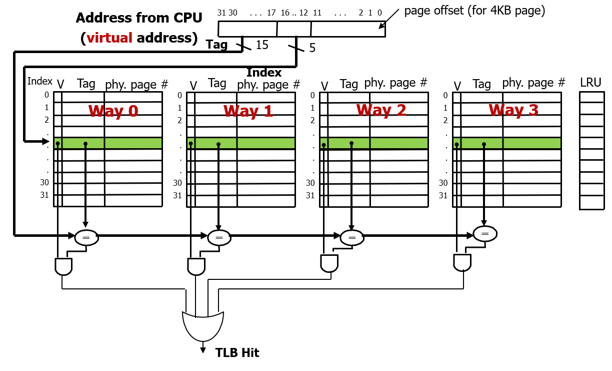 TLB Hit를 판별할 때는 셋 인덱스에 접근하여 4개의 way로 모두 가서 일치하는 tag와 valid 비트의 설정을 확인한다.