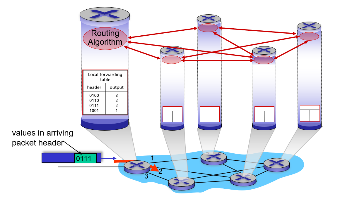 이때 포워딩 테이블을 만들 때는 다른 라우터와 정보를 주고 받은 뒤, 이 정보를 input으로 넣고 라우팅 알고리즘을 돌려서 만든다. 이때 돌릴 수 있는 라우팅 알고리즘은 여러가지가 있어서 하나를 선택한다.