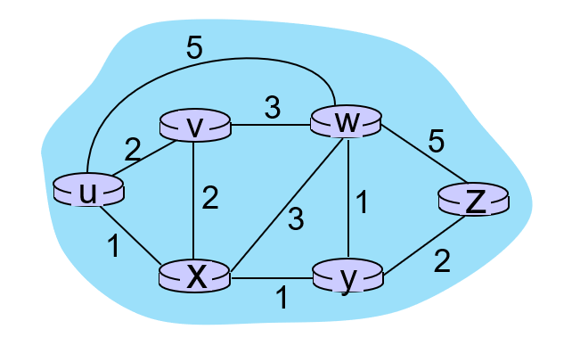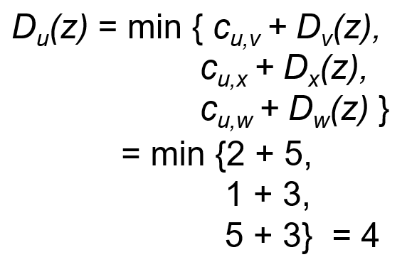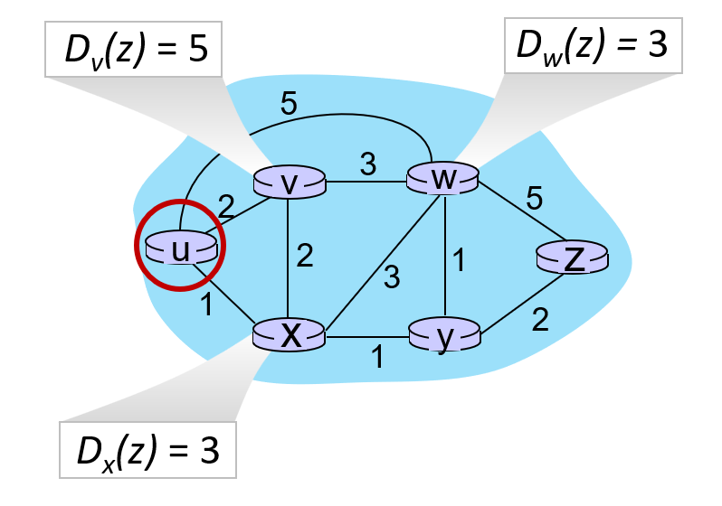 u와 인접한 v, x, w 로 부터 각각 그 노드(라우터)들이 알고있는 z까지의 최단 거리 정보를 받는다.