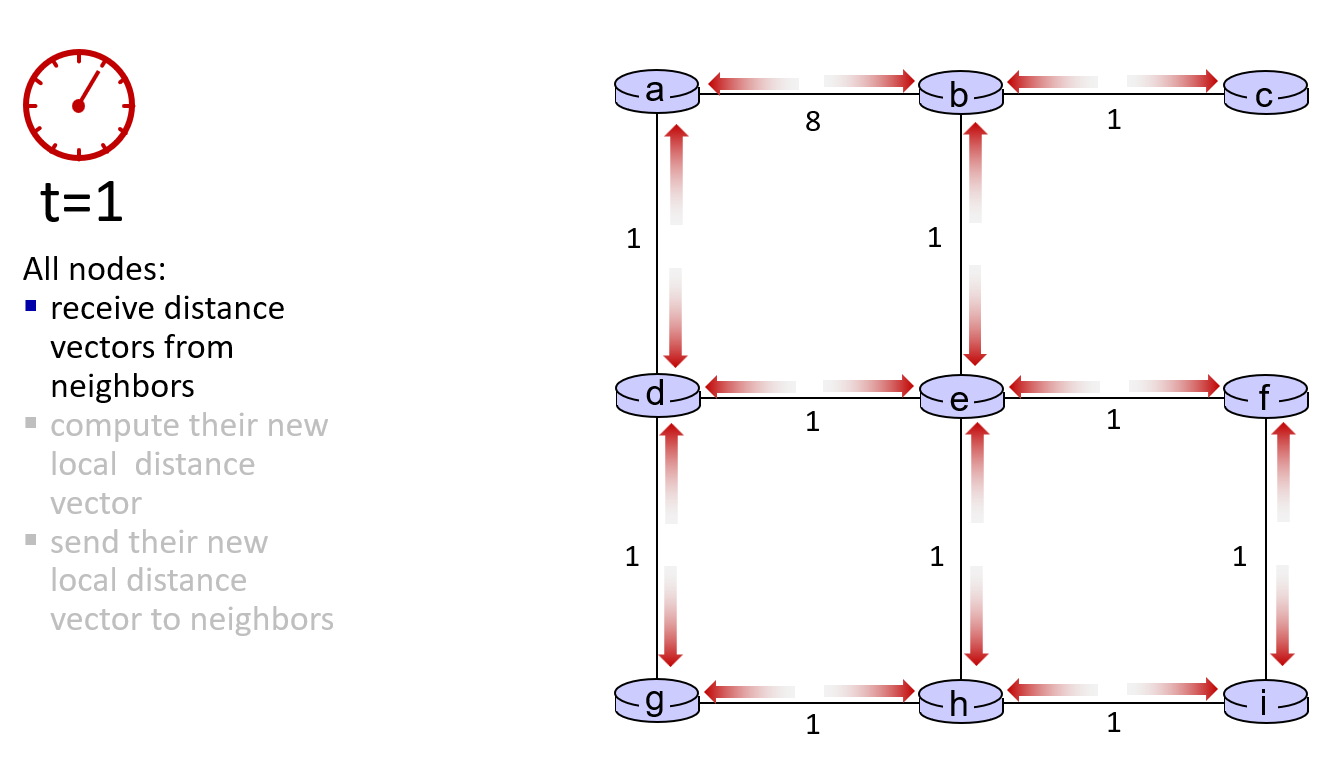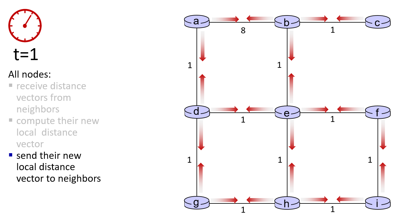t = 1 시점이 되면 모든 라우터가 이웃노드가 보낸 DV 정보를 받는다.