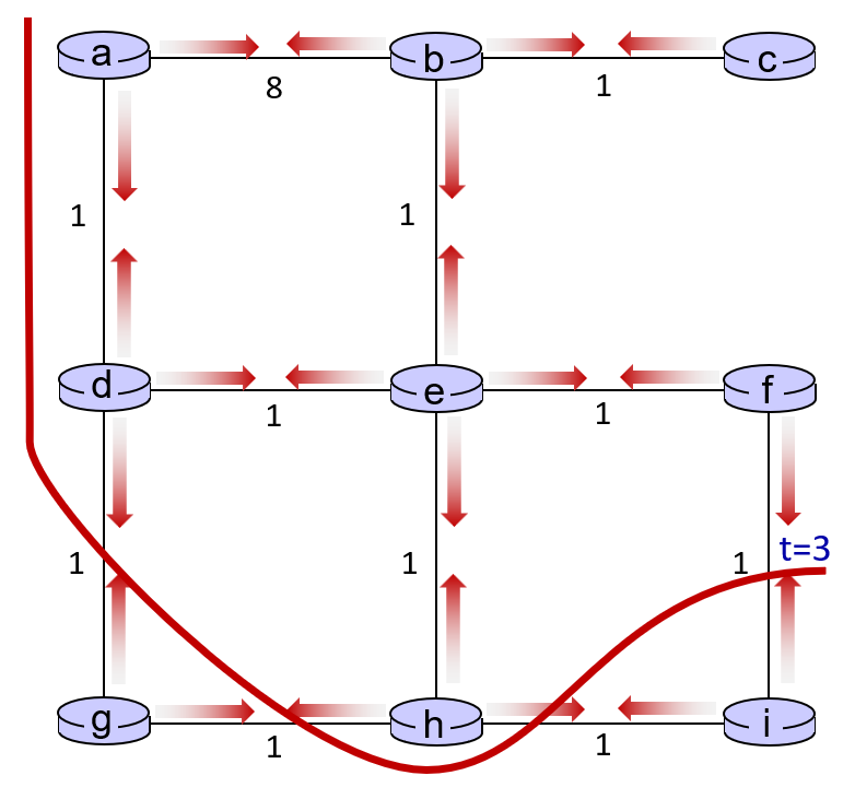 t = 3일때는 그림과 같은 경계까지 퍼지고, t = 4 일때는 모든 라우터에 퍼진다.