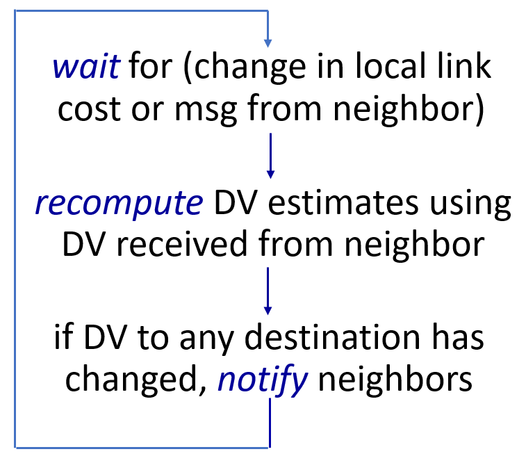 처음에 각 노드는 자신의 link cost가 변경되거나, 이웃 노드로부터 갱신된 distance vector를 받을 때까지 기다린다.
