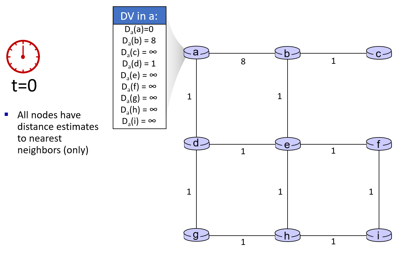 t = 0 일 때 라우터 a 의 DV는 위와 같다.