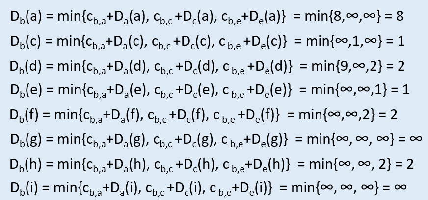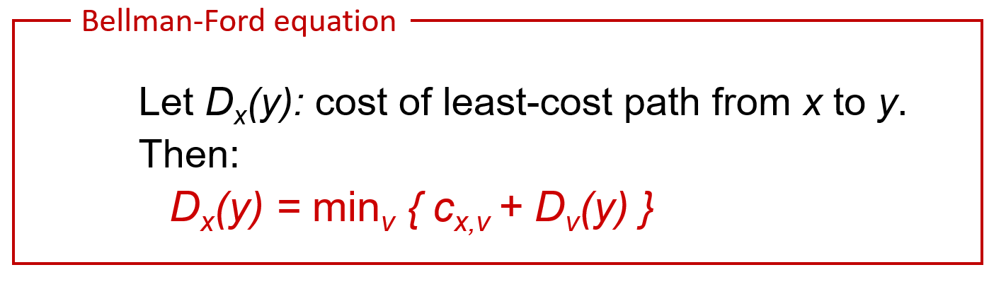 나(x)로부터 목적지(y)까지 가는데, 필요한 최단 경로는 나의 이웃 노드 v가 알려준 Dv(y) 값들과 내가 알고있는 v까지의 거리 Cx,v 로부터 최소값을 계산해서 얻는다는 아이디어다.