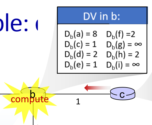 t=1 시점에서, 라우터 b 가 이웃 라우터로부터 DV정보를 받은 상황이다.