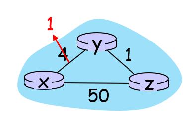 이 정보를 z 에게 보내면, z는 이를 받아서 y를 경유해서 x로 가면 48 + 1 = 49 의 비용으로 갈 수 있다고 판단한다.
