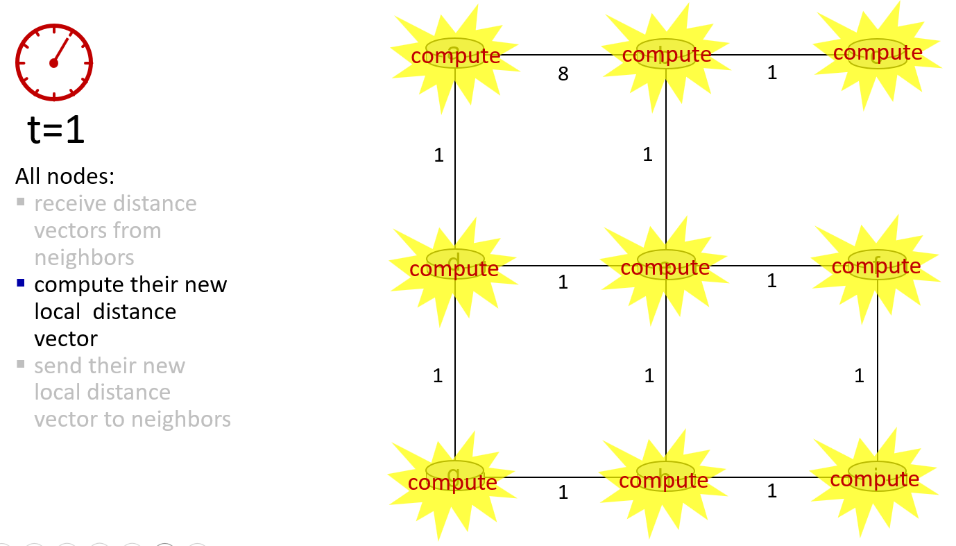 t=1 시점에서는 각 라우터가 자신과 이웃한 노드까지의 거리 정보밖에 갖고 있지 않다.