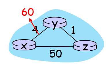 (이때 기존의 Dx(y) 값은 사용하지 않는다. 링크의 비용이 증가하는 쪽으로 갱신되어 최소값도 증가했다면, 증가한 것으로 계산해야 되기 때문이다.)