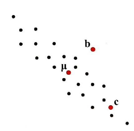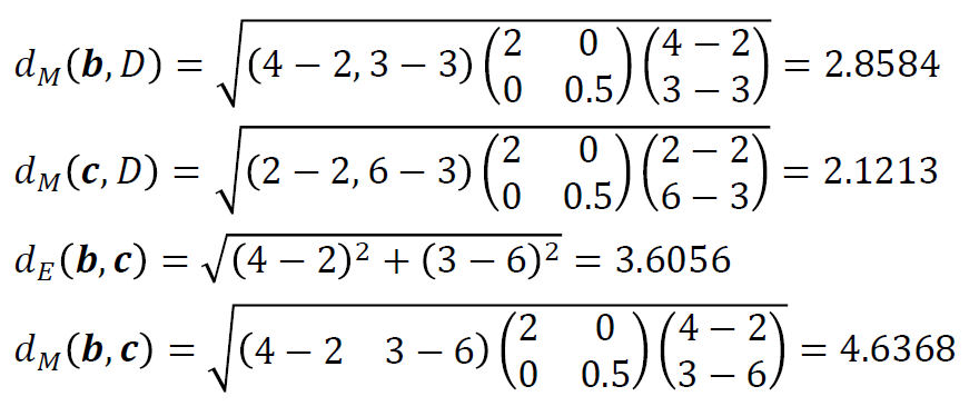 Dm(b, D) 와 Dm(c, D) 로부터, 점 c가 점 b 보다 더 분포에 가깝다는 것을 알 수 있다.