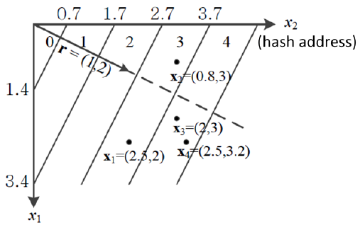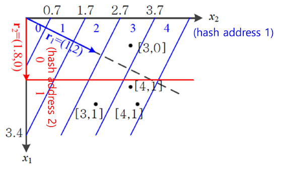 첫 번째 해시함수 h1 은 위 예제에서 본 함수를 사용하고, 두 번째 해시함수 h2 는 r = (1.8, 0), b = 0 의 값을 갖는다.