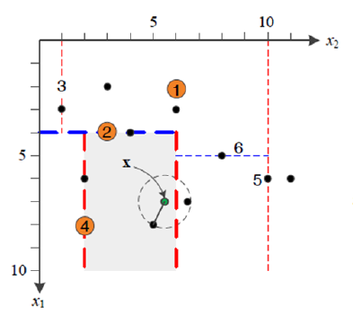 이제, kd트리와 이 그림으로부터 제일 가까운 이웃을 찾아보자.
