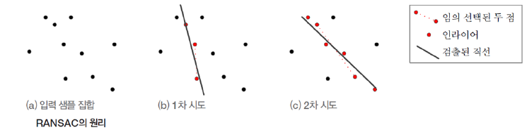 이 두 점으로부터 직선식을 하나 구하고, 나머지 특징벡터들이 이 직선식의 경향을 따르는지 확인한다.