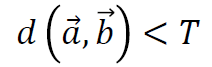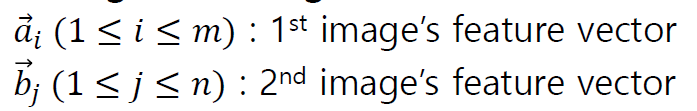 두 이미지의 특징 벡터를 다음과 같이 나타낼 때, 가장 간단한 매칭 방법은 두 특징벡터 사이의 거리가 T 라는 임계값보다 작은지 보는 것이다.