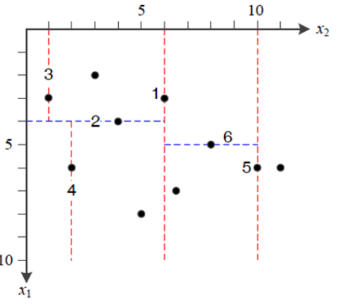 다음과 같은 특징벡터 집합으로 kd tree를 구축해보자.